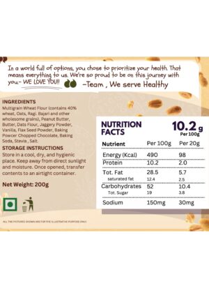 Multigrain Wheat Flour (contains 40% Wheat, Oats, Ragi, Bajari and other wholesome grains), Peanut Butter, Butter, Oats Flour, Jaggery Powder, Vanilla, Flax Seed Powder, Baking Powder, Chopped Chocolate, Baking Soda, Salt.